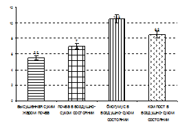 Испытание влияния препарата гуминового комплекса на урожайность проводили на яровой пшенице сорта "Крестьянка". В таблице 11 показано, что под влиянием препарата гуминового комплекса с концентрациями 1,5×10-3 % и 1,5×10-4 % количество семян на 1м2 увеличивается от 160,0–в контроле (вода) до 194,0 и 184,0 шт. соответственно по вариантам. Под влиянием вытяжки из компоста произошло угнетение развития семян. Масса тысячи семян возросла в большей степени под влиянием раствора гуминового комплекса с более высокой концентрацией (с 19,0 до 36,0 г.), что отразилось на урожае зерна 1,7 т/га – в контроле и 2,15 т/га в варианте с концентрацией гуминового комплекса 1,5×10-2 %. Однако, более низкие концентрации растворов (1,5×10-3 % и 1,5×10-4 %) также сказались на увеличении урожайности пшеницы до 1,95 и 1,98 т/га соответственно. Следует отметить, что под влиянием препарата гуминового комплекса происходит увеличение всхожести семян пшеницы на 20%, наблюдается увеличение высоты растений. Обработка гороха препаратом гуминового комплекса проводилось на сорте "Норд" (табл. 11). Из данных следует, что под влиянием растворов препарата с концентрациями 1,5×10-2 %, 1,5 10-3 %, 1,5×10-4 % масса тысячи семян возросла во всех случаях. Лучший результат отмечен в варианте с раствором меньшей концентрации 1,5×10-4 %. Масса тысячи семян в этом случае возросла со 120,7 (контроль) до 180,8. Этот вариант показал наибольшую урожайность - 2,9 т/га (в контроле 1,5 т/га). Под влиянием препарата гуминового комплекса, в частности, при замачивании клубней картофеля в растворе препарата наблюдалось увеличение высоты растений, увеличение площади листьев до 200 см2 , а при опрыскивании растения в стадии цветения до 126,4 см2 по сравнению с контролем 117,5 см2 . Данный показатель у пшеницы и гороха в случае замачивания семян и опрыскивания растений также превышает контроль на 30 и 29% соответственно. Замачивание посевного материала в вытяжке из компоста и опрыскивание этой же вытяжкой показало результат несколько ниже контроля, этот показатель у картофеля составляет 96 см2 и 114,3 см2 ; у пшеницы 129,0 см2 и 146,2 см2 , а у гороха 108,0 см2 и 111,8 см2 соответственно. Химический состав клубней картофеля в вариантах с использованием растворов препарата гуминового комплекса характеризовался повышением содержания азота. Кроме того, повысилось содержание крахмала. Обработка растений раствором препарата гуминового комплекса положительно повлияла на сохранность картофеля при хранении. Количество клубней, пораженных бактериальной гнилью снизилось в 2 раза относительно контроля. Поражение фитофторозом снизилось на 15%, а фузариозом на 10%. Таким образом, полученные данные убедительно показывают положительное влияние препарата гуминового комплекса на рост, развитие и урожайность таких культур как картофель, пшеница, а также горох. Применение созданных на основе вермикомпоста препаратов для обработки сельскохозяйственных растений способствует улучшению экологической обстановки за счет таких факторов как снижение использования высокотоксичных и дорогостоящих химических средств защиты; исключение их негативного воздействия на окружающую среду, человека и животных, полезных организмов составляющих почвенную фауну. Полученные данные говорят о широком спектре действия препарата гуминового комплекса, в том числе участии в защитных механизмах растений, иммун