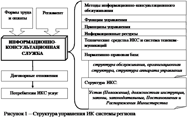 Агропромышленное производство, как основная часть АПК, является самым сложным, трудоемким и наукоемким, а, следовательно, крупным потребителем информационно - консультационных услуг. Особенностью данного периода развития АПК является то, что эти услуги становятся товаром, при этом само сельскохозяйственное производство, до настоящего времени, еще не обрело устойчивых темпов развития. В связи с этим в Федеральном законе «О государственном регулировании агропромышленного производства» определено, что одним из направлений государственной поддержки является деятельность служб консультации и информации. Анализ данной темы подтверждает, что состояние организационно-правовых форм информационно-консультационного обслуживания агропромышленного производства может быть самым различным и зависит оно от уровня развития того или иного субъекта РФ. Считаем целесообразным информационно-консультационную систему понимать как совокупность взаимосвязанных и взаимообусловленных следующих элементов: информационные ресурсы, методы, принципы, телекоммуникационные сети, технические средства управления, функции, структура, информационно-консультационная служба и др. (рис.1)