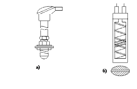Рис.2 Платиновый термометр сопротивления а) с подвижным штуцером б) чувствительный элемент Серийно выпускаемые в нашей стране термометры сопротивления приведены в таблице 1 . Чувствительными элементами полупроводниковых термометров сопротивления (термисторов) являются смеси окислов меди, марганца, магния, никеля, кобальта и др. Смеси двух-трех окислов со связывающими добавками измельчают, спекают и обжигают, придавая им форму небольших цилиндриков, шайбочек или бусинок (рис.3). В торцы чувствительных элементов вжигают контакты. При увеличении температуры термометра его сопротивление резко уменьшается согласно зависимости: R - значение сопротивления при 293 К; Т - температура, К; В - постоянная, зависящая от свойств полупроводникового материала. Таблица 1.
