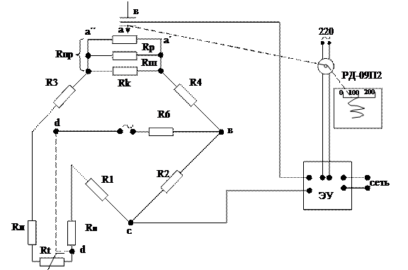 = 0,02 - 0,14 кОм, ТКС В основу работы электронных автоматических мостов КСМ2 положен нулевой метод измерения сопротивления. Измерительная схема автоматического электронного равновесного моста КСМ2 представлена на рисунке 4. К точкам подключен источник питания - напряжение переменного тока 6,3 В. Подключение термометра к прибору производится по трехпроводной схеме. В этом случае сопротивление проводов распределяется между двумя прилегающими плечами поста. Применение трехпроводной схемы для присоединения термометра снижает величину температурной погрешности, вызванной изменением сопротивления соединительных проводов RЛ) вследствие изменения температуры окружающего воздуха. При изменении температуры контролируемого объекта изменится сопротивление
