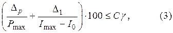 где Δр – предел допускаемой абсолютной погрешности образцового прибора, контролирующего входной параметр при давлении или разряжении, равном верхнему пределу измерений поверяемого преобразователя, в тех же единицах, что и Рmax ; Рmax – верхний предел измерений поверяемого преобразователя; МПа (кгс/см2 ); Δ1 - предел допускаемой абсолютной погрешности образцового прибора, контролирующего выходной сигнал при верхнем предельном значении выходного сигнала поверяемого преобразователя, мА; Imax – верхнее предельное значение выходного сигнала, мА; Io – нижнее предельное значение выходного сигнала, мА (I0 =0 – для преобразователей с выходными сигналами 0-5 и 0-20 мА; I0 =4 мА - для преобразователей с выходными сигналами 4 и 20 мА); γ – предел допускаемой основной погрешности проверяемого преобразователя, %; С – коэффициент равный ¼. [2]. 2) при определении значений выходного сигнала в мВ по падению напряжения на образцовом сопротивлении