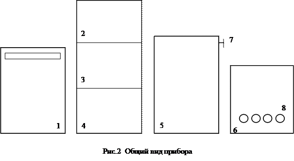 который поступает на АЦП 6 с цифровой индикацией и устройство деления 7, формирующее выходной унифицированный сигнал постоянного тока 0…5 мА для дистанционной передачи сигнала оптической плотности на периферийные устройства (контроллер, ПК). Результат не зависит от колебаний источника света, температурной погрешности, а зависит только от пропускания измеряемой среды. 4.2. Конструктивные особенности. Органы управления и индикации. Мутномер представляет собой измерительную систему, состоящую из оптико-электронного блока, оптрода (проточного или лабораторного) и световодных жгутов. Оптрод лабораторный (рис 2.2) представляет собой пластмассовый корпус (1), в торцах которого установлены линзы (2), обеспечивающие параллельный световой поток в измеряемой среде, помещаемой в стеклянных кюветах (3). Световой жгут (4) длинной 0,7 м фиксируется в разъемах гайками 5. Лабораторный оптрод предназначен для лабораторных исследований.