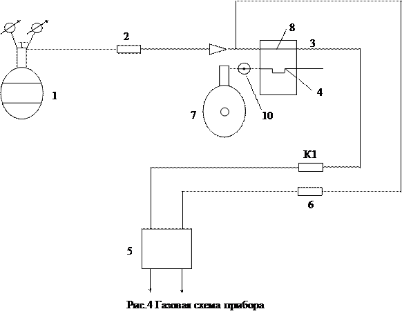 Приборы серии ЛХМ-8МД сконструированы в блочном исполнении и состоят из следующих блоков: 1. Прибор для регистрации хроматограмм – потенциометр КСП-4 2. Измерительный блок детектора по теплопроводности (ДТ) 3. Блок измерительный для детектора ионизации в пламени (ПИД) 4. Блок программирования температуры в термостате 5. Термостат с испарителем, дозатором, колонками и детектором 6. Блок подготовки газов 7. Дозатор 8. Ручки регулирования расхода газа-носителя Газ-носитель (воздух) из баллона 1 проходит через осушитель 2 (БПГ) и поступает в кран-дозатор клапанного типа 3. В положении 1 “Отбор” ручка 9 крана-дозатора находится в правом положении, анализируемый газ из баллона 7 проходит через расходомер постоянного перепада 10 и дозирующий объем 4. при этом обе колонки, заполненные сорбентом Полисорб-1 продуваются газом-носителем. Затем дозатор переводится в положение 2. Газ-носитель проходит верез дозирующий объем, подхватывает пробу анализируемого газа и переносит ее в хроматографическую колонку К1, где происходит разделение анализируемого газа на составляющие компоненты, а затем в детектор 5. На рис.5 приведена электрическая схема хроматографа. Основными элементами схемы являются четыре платиновые нити, свитые в двойную спираль и помещенные в ячейки прямоточного типа, размещенные в корпусе детектора. Платиновые термосопротивления соединены между собой и образуют неравновесную мостовую схему. Две нити помещены в ячейку, через которую постоянно продувается газ-носитель (сравнительная камера). Две другие нити помещены в рабочий канал. Мост сбалансирован, когда теплопроводность газов в обоих каналах одинакова. Если в рабочем канале появился компонент из анализируемой смеси, теплопроводность газа изменяется, следовательно изменяются температура и сопротивление нитей, что вызовет разбаланс мостовой схемы. Величина разбаланса моста служит мерой концентрации компонента в газе-носителе в данный момент. Выходной сигнал подается на электронный самопишущий потенциометр КСП-4 и через делитель записывается в виде хроматограммы.
