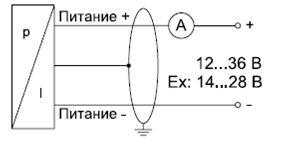Рис. 4.1 Датчик давления DMP 331 - универсальный недорогой датчик давления для различных отраслей промышленности, пропорционально преобразующий давление рабочей среды в электрический сигнал. Возможно измерение абсолютного или избыточного давления - как статического, так и динамического. Технические характеристики: Диапазон измерений: 4кПа – 4МПа Выходной сигнал: 4-20 мА Основная приведенная погрешность ±g%: ± 0,2% температура измеряемой среды: -25…125°С Условия эксплуатации: Температура окружающей среды: 0…50°С Области применения датчика давления DMP-331: пневматика, гидравлика; технологические процессы; охрана окружающей среды; измерительное оборудование; пищевая промышленность (с торцевой мембраной); коммунальное хозяйство. Схема внешнего электрического соединения датчика приведена на рис. 4.2