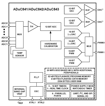 Был выбрана микроконтроллер ADuC843 (ADX09) Микросхемы ADuC841/ADuC842/ADuC843 - это специализированные устройства приема и обработки аналого-цифровой информации т.н. "однокристальные системы сбора и обработки информации". В состав изделия входит многоканальный аналого-цифровой преобразователь, сдвоенный ЦАП, оптимизированный микроконтроллер (совместим по набору команд с 8051, максимальная тактовая частота 20 МГц, большинство инструкций исполняется за один машинный такт). Различие микросхем ADuC841 и ADuC842 заключается только в цепи тактового генератора: ADuC841 тактируется напрямую от внешнего кварцевого резонатора (до 20 МГц), в то время как, ADuC842 использует внешний резонатор на 32 кГц с последующим "разгоном" во встроенной петле ФАПЧ до внутренней тактовой частоты ядра (не более 16.78 МГц). Микросхемы полностью совместимы по выводам с более ранними моделями ADuC812/ADuC831/ADuC832. Отличительные черты Процессор: однотактовый, архитектуры 8052, с максимальной производительностью 20 млн. инструкций в секунду; 12 источников прерываний с двумя уровнями приоритета; сдвоенный указатель данных, улучшенный 11-битный указатель cтека. Память: 62 кБ Flash-памяти программ; 4 кБ Flash-памяти данных; возможность программирования в системе; время хранения данных - 100 лет, количество циклов перезаписи - 100 000; 2304 байт ОЗУ. Аналоговая периферия: 8-канальный, 12-битный, высокоточный АЦП с максимальной скоростью выборок 420 000 в секунду; встроенный источник опорного напряжения (15*10-6/ºС); контроллер прямого доступа к памяти, схема быстрой передачи выборок АЦП в память ОЗУ; сдвоенный сигма - дельта ЦАП-ШИМ (16-бит); встроенная функция контроля температуры (точность +/-1.5ºС).