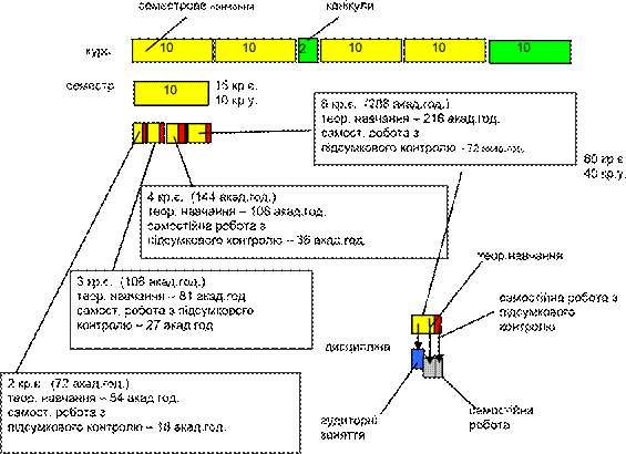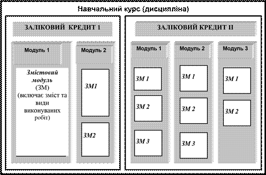 Рис. 1. Загальна схема структури навчального курсу з точки зору ECTS. Таблиця 2. МОДУЛЬНА СТРУКТУРА НАВЧАЛЬНОЇ ДІЯЛЬНОСТІ СТУДЕНТА