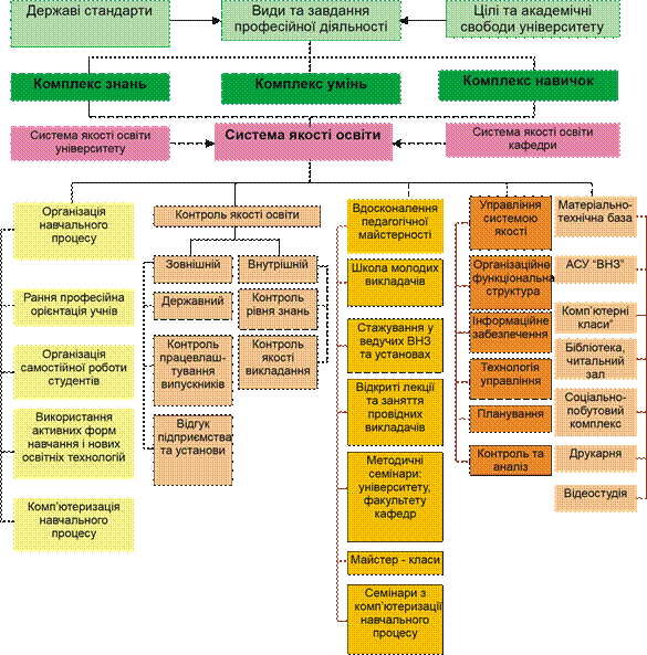 Рис. 1. Складові управління вищою освітою Однак проектування вищої освіти вимагає особливої уваги всіх суб’єктів. Якість вищої освіти закладається саме при проектуванні. Функції інших складових управління освітою полягають у забезпеченні запланованої якості. Освітні стандарти як проект вищої освіти є основою впровадження кредитно-модульної системи підготовки. Мобільність студентів вищих навчальних закладів та працевлаштування випускників можливі лише за умов надання не тільки академічної кваліфікації, а й професійної, що головне. Студент навчається у вищому навчальному закладі з метою одержання роботи відповідно до рівня освіти. Саме професійна компетентність випускників має бути критерієм якості вищої освіти та взаємовизнання її результатів. Сьогодні метою професійної підготовки є ключова вимога ринку праці до кваліфікації випускника вищого навчального закладу – «уміння». Тобто цілі навчання у вищій школі є зовнішніми та визначаються змістом майбутньої професійної діяльності випускників. Для багатьох європейських вищих навчальних закладів забезпечення бакалаврів професійною кваліфікацією - нова проблема. Наш досвід може бути корисним іншим. У теорії менеджменту є така теза, що будь-який успіх треба використовувати і зосередити увагу на своїх можливостях. Мета такого підходу - використання власних досягнень і трансформація їх у фундамент наступної діяльності. У стандартах вищої освіти України ми ігноруємо такий підхід. Нагадаю, що розробка стандартів виконана відповідно до методики, запропонованої наказом № 285 від 1998 р., яка по суті є дослідницькою роботою і дозволила системно розглянути цілі підготовки та зміст навчання. Позитивними сторони стандартів вищої освіти України є: Відбір змісту навчання за критерієм «уміння фахівця». Пристосованість до КМСОНП. Наявність варіативної частини навчання. Позитивні сторони методології розробки: А. Вирішення проблеми відбору змісту навчання за умов визначених критеріїв - професійних умінь, що необхідні для майбутньої діяльності. Б. Пристосованість до кредитно-модульної системи організації навчального процесу. Зміст навчання подається як перелік змістових модулів, що випливає із цілей підготовки. Кожен модуль оцінено за трудомісткістю через кредити. Взаємовизнанню модулів немає перешкод, що створює умови мобільності студентів. В. Наявність варіативної частини навчання, що дозволяє формувати індивідуальні «траєкторії» підготовки.