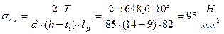 что меньше [s]см =140 Н/мм2 для чугунной ступицы шкива. Условие выполнено Рассчитаем шпоночное соединение для передачи вращающего момента Шпонка призматическая (табл. 12.5): b=20 мм, h =12 мм, t1 =7,5 мм. Длина шпонки l=53 мм,рабочаядлина lp = l - b =53 – 20 = 33 мм. Расчетные напряжения смятия: