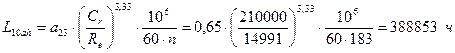 Расчетная долговечность более нагруженного подшипника опоры 2 при a23 = 0,65