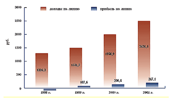 В 2001 году сохранилась положительная динамика относительных показателей деятельности ОАО "Электросвязь" Омской области. Так прибыль на работника возросла на 43,7%, доходы на линию – на 24%, прибыль на линию – на 23%.