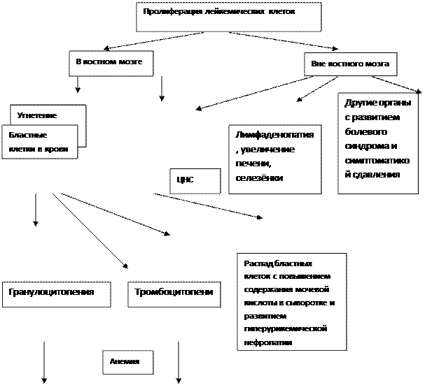 В основе деления Л на острые и хронические лежит морфология клетки. Острые лейкозы – гетерогенная группа опухолевых заболеваний, при которых костный мозг поражается бластами – морфологически незрелыми клетками, при этом вытесняются элементы кроветворения в костном мозге и инфильтрация бластами внутренних органов. Частота встречаемости 5 на 100 000 населения в год ЭТИОЛОГИЯ Неизвестна Предрасполагающие факторы: -Ионизирующее излучение -Химио- и радиотерапия других опухолей -20% ОЛ следствие курения -Бензол -При врождённых заболеваниях за счёт повышенной хромосомной нестабильности -Т-клеточный вирус – 1 -Обменная (эндогенная) теория: накопление метаболитов триптофана и тирозина ПАТОГЕНЕЗ 1) ОЛ - следствие мутации в генетическом материале кроветворной клетки, которая, размножаясь, образует опухолевый клон 2) Диссеминация опухолевых клеток – метастазирование по кроветворной системе 3) Опухолевая прогрессия – в её основе повышенная изменчивость хромосом и образование новых субклассов, из-за которых изменяются свойства опухоли КЛАССИФИКАЦИЯ ФАБ – классификация I – Нелимфобластные, миелогенные (миелоидные) лейкозы, подразделяются на 8 типов II – Лимфобластные – 3 типа III – Миелопоэтические дисплазии или миелодиспластический синдром – 4 типа Цитохимическая характеристика ОЛ