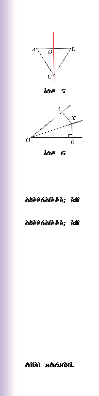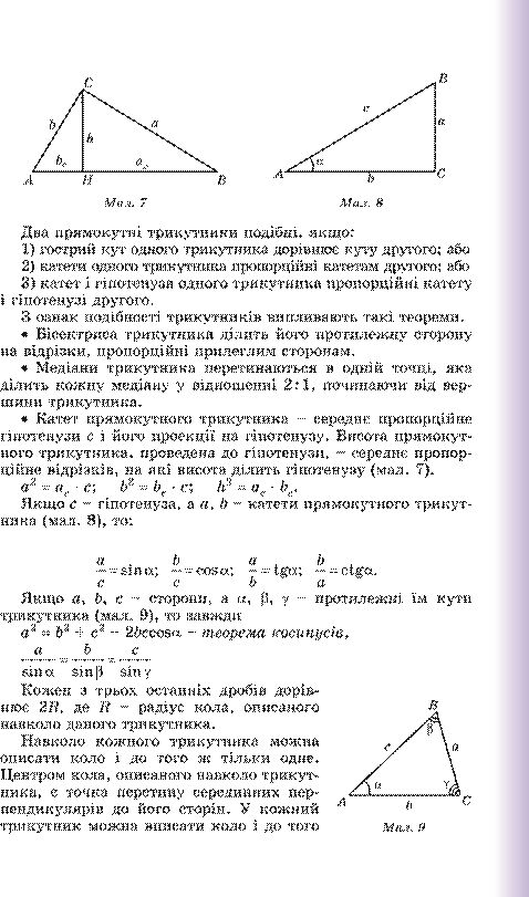 Ãåîìåòðè÷íèì ìіñöåì òî÷îê ïëîùèíè, ðіâíîâіääàëåíèõ âіä êіíöіâ âіäðіçêà, є ñåðåäèííèé ïåðïåíäèêóëÿð äî öüîãî âіäðіçêà (ìàë. 5). ßêùî ÀÎ ÂÎ і ÑÎ À , òî ÀÑ ÂÑ . Ãåîìåòðè÷íå ìіñöå òî÷îê êóòà, ðіâíîâіääàëåíèõ âіä éîãî ñòîðіí, – áіñåêòðèñà öüîãî êóòà (ìàë. 6). Òðèêóòíèêè. Òðèêóòíèê – çàìêíåíà ëàìàíà іç òðüîõ ëàíîê. ×àñòèíà ïëîùèíè, îáìåæåíà òàêîþ ëàìàíîþ, òàêîæ íàçèâàєòüñÿ òðèêóòíèêîì. Êîæíèé òðèêóòíèê ìàє òðè ñòîðîíè, òðè âåðøèíè і òðè êóòè. Ñóìó ñòîðіí òðèêóòíèêà íàçèâàþòü éîãî ïåðèìåòðîì. ßêùî ñòîðîíè òðèêóòíèêà a , b , c , à ïðîòèëåæíі їì êóòè , , , òî: |b – c | < a < b + c ; + + 180. Îçíàêè ðіâíîñòі òðèêóòíèêіâ . Äâà òðèêóòíèêè ðіâíі, ÿêùî: 1) äâі ñòîðîíè і êóò ìіæ íèìè îäíîãî òðèêóòíèêà äîðіâíþþòü âіäïîâіäíî äâîì ñòîðîíàì і êóòó ìіæ íèìè äðóãîãî 2) ñòîðîíà і ïðèëåãëі äî íåї êóòè îäíîãî òðèêóòíèêà äîðіâíþþòü âіäïîâіäíî ñòîðîíі і ïðèëåãëèì äî íåї êóòàì äðóãîãî 3) òðè ñòîðîíè îäíîãî òðèêóòíèêà äîðіâíþþòü âіäïîâіäíî òðüîì ñòîðîíàì äðóãîãî òðèêóòíèêà. Âіäðіçîê, ÿêèé ñïîëó÷àє ñåðåäèíè äâîõ ñòîðіí òðèêóòíèêà, – éîãî ñåðåäíÿ ëіíіÿ. Ñåðåäíÿ ëіíіÿ òðèêóòíèêà ïàðàëåëüíà éîãî òðåòіé ñòîðîíі і äîðіâíþє її ïîëîâèíі. Òðèêóòíèêè, â ÿêèõ óñі âіäïîâіäíі êóòè ðіâíі, à âіäïîâіäíі ñòîðîíè ïðîïîðöіéíі, íàçèâàþòüñÿ ïîäіáíèìè .