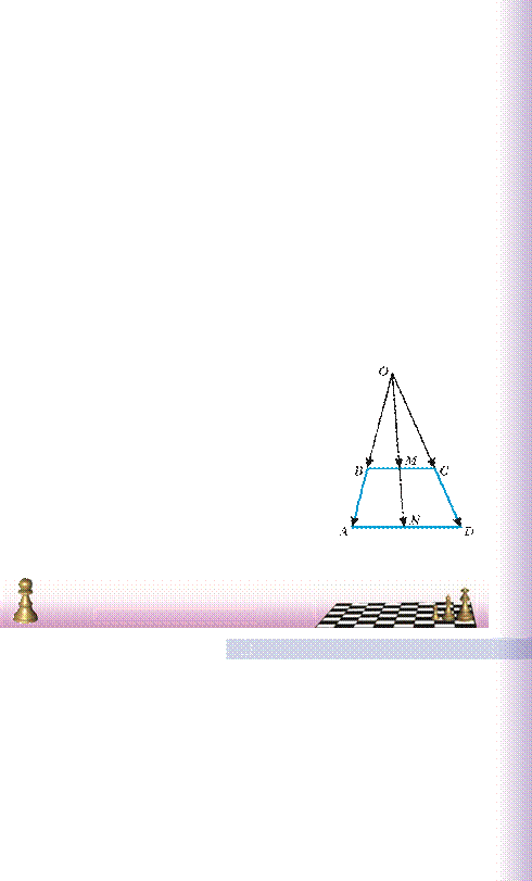 1) OA OB – òî÷êè À і  çáіãàþòüñÿ; 2) AB kCD – ïðÿìі À і CD ïàðàëåëüíі àáî çáіãàþòüñÿ; 3) AB kAC – òî÷êè À ,  , Ñ ëåæàòü íà îäíіé ïðÿìіé; 4) AB · CD 0 – ïðÿìі À і CD ïåðïåíäèêóëÿðíі; 5) , à ÷èñëà m і n äîäàòíі – òî÷êà Ì äіëèòü âіä ðіçîê À ó âіäíîøåííі ÀÌ : Ì m : ï ; 6) a · b |a | · |b | cos – êóò ìіæ ïðÿìèìè, íà ÿêèõ ëåæàòü âåêòîðè a і b , äîðіâíþє ; – Ì – ñåðåäèíà âіäðіçêà À ; – Ì – òî÷êà ïåðåòèíó ìåäіàí – òî÷êà Ì äіëèòü âіäðіçîê À Êîðèñòóþ÷èñü öèìè ñïіââіäíîøåííÿìè, ìîæíà ðîçâ’ÿçóâàòè áàãàòî ãåîìåòðè÷íèõ çàäà÷ òà äîâîäèòè òåîðåìè. Ðîçâ’ÿçóâàííÿ çàäà÷і âåêòîðíèì ìåòîäîì ñêëàäàєòüñÿ ç êіëüêîõ êðîêіâ: – ïîäàíі â çàäà÷і ñïіââіäíîøåííÿ «ïåðåêëàäàþòü ìîâîþ» âåêòîðіâ, òîáòî çàïèñóþòü їõ âіäïîâіäíèìè âåêòîðíèìè ðіâíîñòÿìè; – îòðèìàíі âåêòîðíі ðіâíîñòі ïåðåòâîðþþòü, âèêîðèñòîâóþ÷è ïðàâèëà âåêòîðíîї àëãåáðè; – âіä ìîâè âåêòîðіâ ïåðåõîäÿòü äî ìîâè ãåîìåòðії. ÇÀÄÀ×À 7. Òî÷êà ïåðåòèíó ïðÿìèõ, ÿêèì íàëåæàòü áі÷íі ñòîðîíè òðàïåöії, òà ñåðåäèíè її îñíîâ ëåæàòü íà îäíіé ïðÿìіé. Äîâåäіòü.