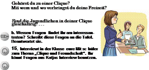 A. Sie hat eine Freundin, mit der sie die ganze Zeit zusammen ist. Sie sind unzertrennlich und seit der siebten Klasse befreundet. Zu einer Clique zu gehören fi ndet sie blöd. Alle machen nur das, was einer bestimmt, sonst wird es Ärger geben. B. Er und sein Freund interessieren sich für Computer und haben schon ein paar Computerspiele selbst entwickelt. Früher gehörten beide zu einer Clique. Bald haben sie jedoch verstanden, dass solche Freizeitverschwendung blöd ist. C. Zu seiner Clique gehören seine Schulfreunde. Sie machen in einer Naturschutzgruppe mit und haben die gleichen Interessen. Das machte sie selbstständiger und kritikfähig. In der Freizeit spielen sie Volleyball oder sitzen in einem Cafå. D. Sie hat viele Schulfreunde. Die meisten besuchen eine Natur-schutzgruppe und haben die gleichen Interessen. Zu ihren besten Freunden gehören auch ihre Eltern. Ihnen kann Katja alle ihre Geheimnisse anvertrauen. Sie fi nden für ihre Tochter immer Zeit. Katja und ihre Eltern sind immer ehrlich zueinander. E. Sie kann sich ihr Leben ohne Freunde nicht vorstellen. Obwohl alle verschieden sind, können sie einander gut verstehen und sich auf einander verlassen. Manchmal verstehen ihre Freunde sie besser, als ihre Eltern.