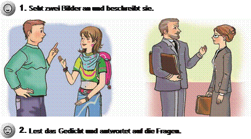 Test zu Lektion 11. Wie sind die Freunde? Sagt das anders. Z.B.: 1. Uwe und Thimo sind im gleichen Alter . – Sie sind gleichaltrig . 1. Uwe und Thimo sind im gleichen Alter. 2. Die Nachbarn haben diese Idee von Herrn Ärger dumm gefunden. 3. Die Eltern fahren in Urlaub und lassen ihre Tochter allein, weil sie sich selbst bedienen kann. 4. Tanja ist eine gute Freundin. Thimo vertraut ihr seine Geheimnisse an . 5. Sie hat einen sehr guten Geschmack. Ihre Kleidung fi nde ich sehr modisch . 6. Die Freundinnen unternehmen alles zusammen. Sie sind immer zusammen . 2. Schreibt zu jeder Wortverbindung ein passendes Äquivalent. Z.B.: 1.irgendwohin gehen oder fahren, um sich zu vergnügen bedeutet etwas unternehmen . 1. irgendwohin gehen oder fahren, um sich zu vergnügen 2. etwas scheint jemandem falsch 3. sich auf jemanden verlassen 4. mit etwas unzufrieden sein 5. etwas jemandem anvertrauen 6. sagen oder schreiben, dass jemand an etwas teilnehmen will 3. Übersetzt die Sätze ins Deutsche. 1. Я можу на тебе покластися? 2. Він тобі не довіряє. 3. Друзі записалися на комп’ютерні курси. 4. Чому ти мені вказуєш, що мені робити? 5. Їй лише десять років, а вона така самостійна! 6. Ви однолітки? – Так, ми народилися в один рік. 4. Ergänzt die Sätze. 1. Ich erinnere mich oft . . . meine erste Schule. 2. Wor… denkst du? 3. Das Kind ist . . . den Streit der Eltern gewöhnt. 4. Ihr Vater arbeitet . . . ein Bankangestellter. 5. In der Klasse gilt sie . . . eine gute Schülerin. 6. Er hält sich . . . einen Helden. 5. Übersetzt die Sätze ins Ukrainische. 1. Plötzlich fi el es dem Jungen ein, dass seine Eltern bald von der Arbeit kommen. 2. Er versuchte die Spuren des Feierns zu verwischen. 3. In der Wohnung schwebte der Geruch der brennenden Zigaretten. 4. Die Eltern müssten daran denken, dass er ihnen das Essen machen wollte. 5. Die Mutter setzte sich erschöpft auf den Sessel. Sie wusste schon alles. 6. Ihr Sohn hat die Schule geschwänzt. 6. Leseverstehen. Lest den Text und macht die Aufgabe unten. MEIN BRUDER HAT GRÜNE HAAREGestern hat sich mein Bruder Johannes (1) eine Haarsträhne grün färben lassen. Die restlichen Haare hat er mit Baby-Öl eingeschmiert, dann hat er sich ganz schwarz angezogen und sich so an den Kaffeetisch gesetzt. Mein Bruder ist fünfzehn und ich bin dreizehn. Er sagt, er sei ein Punk. Wenn ich ihn frage, was das ist, weiß er das selber nicht so genau. Jedenfalls (2) gab es einen ziemlichen Krach , als er so vor der versammelten Familie erschienen ist. Meine Eltern haben sich noch nicht mal so aufgeregt, aber dann war da noch meine Tante Vera. Und die ist fast vom Stuhl gefallen, als der Johannes in dem Aufzug reingekommen ist. „Ihr seid ja wohl heute alle total verrückt geworden!“, hat sich Tante Vera aufgeregt. Johannes hat einfach gar nichts gesagt und hat angefang en, Kuchen zu essen. Das hat meine Tante natürlich noch wütender gemacht. Sie fi ng richtig an zu (3) kreischen : „Lasst ihr die Kinder denn alles machen, was ihnen in den Kopf kommt?“ (4) Sie funkelte meine Eltern an . Mein Vater sagte bloß: „Der Junge ist doch alt genug! Der muss schon wissen, was er tut.“ „Alt genug? Fünfzehn Jahre alt ist der! Ein ganz grünes Bürschchen!“ Als Tante Vera das Wort „grün“ sagte, mussten wir alle auf die grüne Haarsträhne gucken und lachen. Nur Tante Vera, die musste nicht lachen. (5) Sie hat auch gar nicht kapiert , dass wir über die Haare gelacht haben, sondern dachte natürlich, wir lachen über sie und ärgerte sich schrecklich. „Die wissen doch vor lauter Wohlstand nicht mehr, was sie noch machen sollen! Wisst ihr eigentlich, was wir mit fünfzehn gemacht haben? Mitten im Krieg! Wir sind bei Bauern (6) betteln gegangen! Um ein paar Rüben! Weil wir gehungert haben! “ „Lass doch, Vera! Die Kinder leben doch heute in einer ganz anderen Welt als wir damals.“ Meine Mutter stand auf und räumte die Kaffeetassen weg. (7) Tante Vera war in Fahrt . „Wir wussten nicht, ob wir lebendig bleiben! Und ihr färbt euch die Haare grün! Und schmiert euch Öl in den Kopf! Guckt mal lieber in eure Schulbücher!“ (8) „Hör doch bloß auf mit deinen Kriegsgeschichten ! Versuch doch einfach mal einigermaßen cool zu bleiben, Vera!“ Dann ist er aufgestanden und hat gesagt: „Vom Frieden hast du wohl selber nicht allzuviel kapiert. Sonst würdest du hier nicht so einen Krach machen.“ Dann ging er einfach raus. Ich bin rausgegangen. Aus Johannes Zimmer (9) dröhnte knalllaute Musik . Ich habe eine Riesenwut gekriegt auf meinen Bruder. Ich bin in sein Zimmer gerannt und habe gebrüllt: „Setzt dir wenigstens deine Kopfhörer auf, wenn du schon eine solche Musik hörst.“ Abends im Bett musste ich nochmal über alles nachdenken. Auch über das, was Tante Vera gesagt hatte. Welche Wörter und Wortverbindungen geben den Inhalt des Textes richtig wieder? Wählt aus drei gegebenen Lösungen eine richtige. 1. a. eine größere Menge Haare, die zusammen sind b. einen Zopf c. ein paar Haare 2. a. es gab ein angenehmes Gespräch b. es gab einen sehr kurzen Streit c. es gab einen Skandal 3. a. mit lauter Stimme schreien b. laut weinen c. langsam sprechen 4. a. zündete meine Eltern an b. sah wütend meine Eltern an c. lachte über meine Eltern 5. a. sie hat gar nichts verstanden b. sie hat alles vergessen c. sie hat Kopien gemacht 6. a. helfen b. dauernd bitten c. klauen 7. a. Tante Vera wurde immer wütend b. Tante Vera fuhr nach Hause c. Tante Vera sprach ruhig weiter 8. a. Genug mit deinen Kriegsgeschichten! b. Erzähl deine Kriegsgeschichten weiter! c. Wiederhol deine Kriegsgeschichten noch! 9. a. tönte sehr stille Musik b. tönte sehr laute Musik c. tönte lustige Musik |
