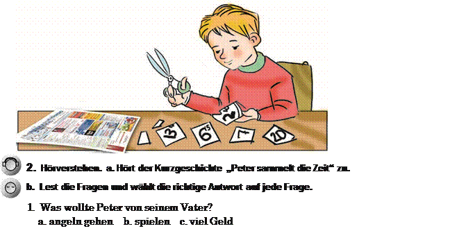 2. Was wollte Peter in Zukunft haben? a. genug Zeit b. viele Kinder c. reich sein 3. Was machte er dafür? a. er schnitt Zeit aus Zeitungen und Büchern aus und sammelte sie b. er lernte gut c. er las viele Bücher und Zeitungen 4. Wo versteckte er seine Schachtel? a. im Spielzeug b. im Schreibtisch c. im Kleiderschrank 5. Was wollte er mit der gesammelten Zeit tun? a. verkaufen b. nur für sich sammeln c. den Leuten verleihen oder verkaufen 6. Warum wollte Peter der Frau mit zwei Kindern helfen? a. Sie ließ ihre Kinder neben dem Spielzeugschaufenster nicht ste-hen bleiben. b. Sie verbot ihren Kindern zu spielen. c. Sie hatte keine Zeit mit ihren Kindern zu spielen. 7. Was schlug Peter der Frau vor? a. sein Geld b. selbst mit Kindern zu spielen c. seine Zeit 8. Wie viel Zeit schenkte Peter dem Liebespaar? a. drei Minuten b. eine halbe Stunde c. drei Stunden 9. Was machte das Liebespaar mit Peters Zeit? a. Es bedankte sich bei Peter für das Geschenk. b. Es warf diese Zeit weg. c. Es gab diese Zeit dem Jungen zurück. 10. Was wollte Peter an einer Autoreparaturstelle? a. das Sportauto anschauen b. mit dem Mechaniker sprechen c. das Sportauto mal fahren 11. Was schlug der Automechaniker dem Jungen vor? a. nach Hause zu gehen b. Autobilder zu sammeln c. dem Vater zu helfen 12. Wie bezeichnete Peter Erwachsene? a. als dumme Leute b. als unhöfl iche Leute c. als merkwürdige Leute
