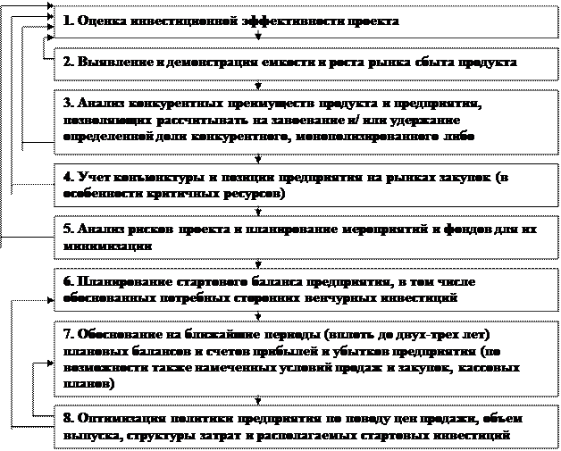 Упрощенный алгоритм составления бизнес-плана венчурного предприятия • вторая часть нацелена на «приземление» ранее обсуждавшихся перспектив с точки зрения требований к необходимым инвестициям, покрывающим дефицит собственных средств инициаторов проекта, а также на демонстрацию возможностей обеспечения финансовой устойчивости предприятия (и только в зависимости от этого — возможности распределить часть его прибылей на дивиденды для инвесторов); • существенно, что именно во второй части алгоритма (когда, как правило, выясняется, что финансово-балансовые перспективы предприятия на ближайшее время не столь уж радужны) возвращаются к вопросу о ценах, объемах выпуска продукта, структуре текущих издержек и баланса предприятия, пытаясь их оптимизировать с учетом располагаемых и минимально потребных дополнительных инвестиций (содержание блока 8); • в алгоритме бизнес-плана крайне важны обратные связи между его блоками (причем важно и убедительно показать как их, так и их понимание составителями плана венчурному инвестору). Таких обратных связей как бы три «пучка»: связи от блоков части первой алгоритма на его первый, «запевный» блок так, что первоначально уточняются исходные данные для расчета инвестиционной эффективности проекта); связи от завершающего блока алгоритма к разделам, посвященным планированию финансовых балансов, общих (без учета и с учетом налогов) и распределяемых прибылей предприятия (при этом в финансовые показатели вносятся коррективы, улучшающие этим показатели по результатам оптимизации политики предприятия по поводу цен сбыта, структуры текущих затрат и объема выпуска); связи от завершающего блока алгоритма опять-таки к его первому блоку (еще одно уточнение исходных данных для интегральной оценки инвестиционной эффективности проекта); • в остальном важно, чтобы указанная в схеме логическая последовательность работы над бизнес-планом реализовывалась четко, без пропусков и какого-либо «выхолащивания» стандартных стадий и разделов бизнес-плана. Обычно бизнес-план включает в себя такие составные части[5] : - титульный лист; - резюме; - историю бизнеса ( если предприятие уже действует ); - описание продуктов (услуг); - описание дел в отрасли, товарные рынки; - конкурентов: оценку и выбор конкурентной стратегии; - производственный план; - план маркетинга; - организационный план; - финансовый план и оценку риска; - план исследований и разработку; - приложения. При одинаковой структуре и форме построения не существует каких-либо обязательных образцов бизнес-плана . Более того, глубина и приоритетность рассмотрения различных вопросов варьируют от проекта к проекту. Бизнес-план следует разрабатывать с максимальной точностью как оптимизационный процесс с обратной связью, взаимосвязью отдельных частей, а также оценкой коммерческого, технического и предпринимательского рынков. При возникновении узких мест или неадекватной рентабельности бизнес-плана нужно внимательно проанализировать такие параметры, как размер рынка, производственная программа, оборудование, и попытаться найти лучшие альтернативы с тем, чтобы повысить осуществимость проекта и его эффективность. Все допущения, использованные данные и выбранные решения должны быть описаны и обоснованы в бизнес-плане для того, чтобы он стал более понят