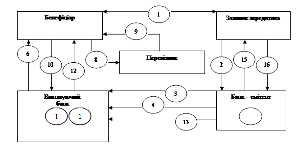 Рис.1.2 Порядок здійснення розрахунків з використанням акредитива: 1 - укладання угоди, якою передбачається акредитивна форми розрахунків; 2 - подання аплікантом заяви на відкриття акредитива; 3 - банк-емітент відкриває акредитив і просить банк в країні покупця авізувати акредитив і в ряді випадків підтвердити його; 4 - пересилка акредитива банком-емітентом банку-кореспонденту; 5 - авізуючий банк при отриманні ним акредитива від банку емітента повідомляє бенефіціара про відкриття акредитива на його користь; 6 - отримавши акредитив від авізуючого банку і переконавшись в тому, що умови повністю відповідають контракту, експортер відвантажує товар на адресу імпортера; 7 - бенефіціар передає комплект документів, передбачених умовами акредитива. Авізуючий банк стає виконуючим; 8 - виконуючий банк здійснює перевірку документів на відповідність умовам договору та акредитиву; 9 - у разі відповідності документів вимогам акредитива виконуючий банк здійснює платіж тратти; 10 - виконуючий банк відсилає документи і вимогу про відшкодування платежу на адресу банку-емітента; 11 - банк - емітент здійснює перевірку документів; 12 - в разі відповідності документів умовам акредитива сума платежу відшкодовується банком-емітентом виконуючому банку; 13 - передача документів апліканту акредитива; 14 - банк - емітент стягує з апліканта суму платежу; 15 - аплікант акредитива за допомогою документів отримує товар. [19; c.582]
