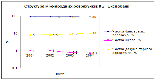 проте на прикладі окремо взятого банку видно, що структура безготівкових міжнародних розрахунків КБ “Експобанк” змінюється так: частка банківських переказів протягом останніх чотирьох років знизилась з 91% у 2001р. до 89% у 2004р.; використання інкасо знизилось з 1% у 2001р. до 0,7% у 2004р., а частка документарних акредитивів навпаки має тенденцію до зростання, що пояснюється вищим ступенем захисту інтересів клієнта, відповідно - 8% у 2001р. і 10,3% - 2004 рік, тобто клієнти банку переконуються у надійності і безпечності використання акредитиву.