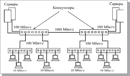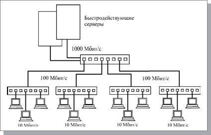 Таким образом, параметры сети 100VG-AnyLAN довольно близки к параметрам сети Fast Ethernet. Однако главное преимущество Fast Ethernet – это полная совместимость с наиболее распространенной сетью Ethernet (в случае 100VG-AnyLAN для этого требуется мост). В то же время, централизованное управление 100VG-AnyLAN, исключающее конфликты и гарантирующее предельную величину времени доступа (чего не предусмотрено в сети Ethernet), также нельзя сбрасывать со счетов. Сеть 100VG-AnyLAN состоит из центрального (основного, корневого) концентратора уровня 1, к которому могут подключаться как отдельные абоненты, так и концентраторы уровня 2, к которым в свою очередь подключаются абоненты и концентраторы уровня 3 и т.д. При этом сеть может иметь не более пяти таких уровней (в первоначальном варианте было не более трех). Максимальный размер сети может составлять 1000 метров для неэкранированной витой пары.[4] Таким образом, сеть 100VG-AnyLAN представляет собой доступное решение для увеличения скорости передачи до 100 Мбит/с. Однако не обладает полной совместимостью ни с одной из стандартных сетей, поэтому ее дальнейшая судьба проблематична. К тому же, в отличие от сети FDDI, она не имеет никаких рекордных параметров. Скорее всего, 100VG-AnyLAN несмотря на поддержку солидных фирм и высокий уровень стандартизации останется всего лишь примером интересных технических решений. Если говорить о наиболее распространенной 100-мегабитной сети Fast Ethernet, то 100VG-AnyLAN обеспечивает вдвое большую длину кабеля UTP категории 5 (до 200 метров), а также бесконфликтный метод управления обменом.[1] 6 СВЕРХСКОРОСТНЫЕ СЕТИБыстродействие сети Fast Ethernet и других сетей, работающих на скорости в 100 Мбит/с, в настоящее время удовлетворяет требованиям большинства задач, но в ряде случаев даже его оказывается недостаточно. Особенно в тех ситуациях, когда необходимо подключать к сети современные высокопроизводительные серверы или строить сети с большим количеством абонентов, требующих высокой интенсивности обмена. Например, все более широко применяется сетевая обработка трехмерных динамических изображений. Скорость компьютеров непрерывно растет, они обеспечивают все более высокие темпы обмена с внешними устройствами. В результате сеть может оказаться наиболее слабым местом системы, и ее пропускная способность будет основным сдерживающим фактором в увеличении быстродействия. Работы по достижению скорости передачи в 1 Гбит/с (1000 Мбит/с) в последние годы ведутся довольно интенсивно несколькими компаниями. Однако, скорее всего, наиболее перспективной окажется сеть Gigabit Ethernet. Это связано, прежде всего, с тем, что переход на нее окажется наиболее безболезненным, самым дешевым и психологически приемлемым. Ведь сеть Ethernet и ее версия Fast Ethernet сегодня далеко опережают всех своих конкурентов по объему продаж и распространенности в мире. Сеть Gigabit Ethernet – это естественный, эволюционный путь развития концепции, заложенной в стандартной сети Ethernet. Безусловно, она наследует и все недостатки своих прямых предшественников, например, негарантированное время доступа к сети. Однако огромная пропускная способность приводит к тому, что загрузить сеть до тех уровней, когда этот фактор становится определяющим, довольно трудно. Зато сохранение преемственности позволяет достаточно просто соединять сегменты Ethernet, Fast Ethernet и Gigabit Ethernet в сеть, и, самое главное, 