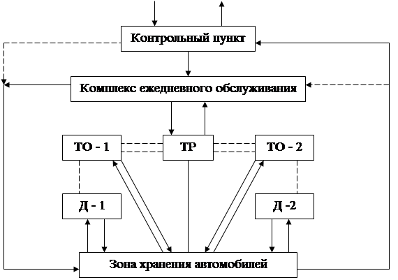 Рисунок 2.1 – Схема организации ТО-1 и ТО-2 Технологический процесс ТО, ТР организован по схеме изображенной на рисунке 2.2. Автомобиль по возвращении с линии проходит контрольный пункт (КП) и направляется в комплекс ежедневного обслуживания. Если автомобиль исправен, то пройдя мойку, он направляется в зону хранения, если не исправен, то в зону ТР. Автомобиль, у которого пробег превысил пробег до очередного технического обслуживания, техническим персоналом загоняются в соответствующую зону (ТО – 1, ТО – 2). Предварительно, за два – три дня, автомобили, пробег которых приближается к очередному техническому обслуживанию, заезжает в участок диагностики и проходят перед ТО – 1 общую (Д – 1), перед ТО – 2 углубленную (Д – 2) диагностику. Если во время ТО у автомобилей обнаружились работы по ремонту, не подлежащие выполнению при проведении ТО, то оформляется заявка на ремонт, и автомобили становятся на участок ТР. Для контроля проведенных работ автомобиль после ТО может быть направлен на участок диагностики.