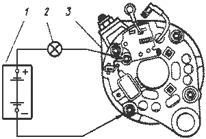 Если лампа горит, то "отрицательные" и "положительные" вентили имеют короткое замыкание. Короткое замыкание "отрицательных" вентилей можно проверить, соединив "плюс" батареи через лампу с одним из болтов крепления выпрямительного блока, а "минус" с корпусом генератора: