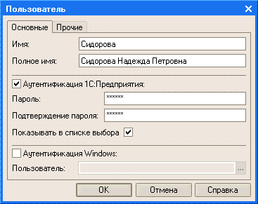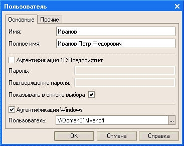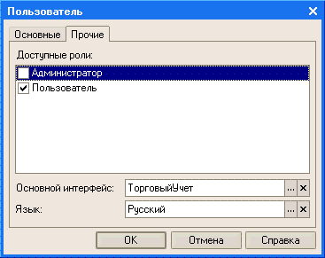 Для каждого пользователя может быть задано имя, идентифицирующее пользователя в системе, полное имя, используемое при отображении справочной информации, и порядок аутентификации (опознования) пользователя системой. Кроме этого, список пользователей позволяет указать роли, которые будут доступны пользователю при работе с прикладным решением, а также основной интерфейс и язык, на котором будут отображаться надписи, содержащиеся в интерфейсе прикладного решения: