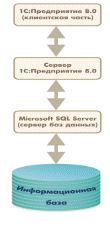 Такой вариант работы обеспечивает легкость установки и эксплуатации автоматизированной системы. При этом для работы с информационной базой не требуются дополнительные программные средства, достаточно иметь операционную систему и 1С:Предприятие 8.0. Файловый вариант 1С:Предприятия 8.0 обеспечивает высокую целостность информационной базы и простое создание резервных копий. Исключена ситуация, когда пользователь может по ошибке (например, при копировании информационной базы) перепутать различные файлы информационной базы и привести, таким образом, систему в неработоспособное состояние. Кроме этого резервное копирование может осуществляться на файловом уровне, путем простого копирования файла информационной базы. Клиент - серверный вариант Клиент-серверный вариант предназначен для использования в рабочих группах или в масштабе предприятия. Он реализован на основе трехуровневой архитектуры «клиент сервер»: