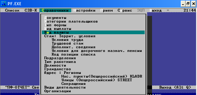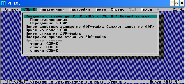 На одном из компьютеров работает сервер 1С:Предприятия 8.0. Программа, работающая у пользователя, взаимодействует с сервером 1С:Предприятия 8.0, а сервер при необходимости обращается к базе данных MS SQL Server. При этом физически сервер 1С:Предприятия 8.0 и MS SQL Server могут располагаться как на одном компьютере, так и на разных. Это позволяет администратору при необходимости распределять нагрузку между серверами. Использование сервера 1С:Предприятия 8.0 позволяет сосредоточить на нем выполнение наиболее объемных операций по обработке данных. Например, при выполнении даже весьма сложных запросов программа, работающая у пользователя, будет получать только необходимую ей выборку, а вся промежуточная обработка будет выполняться на сервере. Обычно увеличить мощность сервера гораздо проще, чем обновить весь парк клиентских машин. Другим важным аспектом использования 3-х уровневой архитектуры является удобство администрирования и упорядочивание доступа пользователей к информационной базе. В этом варианте пользователь не должен знать о физическом расположении конфигурации или базы данных. Весь доступ осуществляется через сервер 1С:Предприятия 8.0. При обращении к той или иной информационной базе пользователь должен указать только имя сервера и имя информационной базы, а система запрашивает соответственно имя и пароль пользователя. 1С:Предприятие 8.0 использует возможности MS SQL Server для эффективной выборки информации: · механизм запросов ориентирован на максимальное использование MS SQL Server для выполнения расчетов и составления отчетов; · просмотр больших динамических списков обеспечивается без выполнения большого количества обращений к базе данных; при этом пользователю предоставляются возможности эффективного поиска, а также настройки отбора и сортировки. Развертывание клиент-серверного варианта и его администрирование выполняется довольно просто. Например, создание базы данных производится непосредственно в процессе запуска конфигуратора (так же, как и для файлового варианта). В поставку системы входит средство администрирования клиент-серверного варианта работы, позволяющее администратору управлять информационными базами и подключением пользователей. 2. Практическая часть 2.1 Разработка программного продукта. "Передача данных в ПФ на магнитных носителях" 1. Запуск программы Запуск программы из NORTONCOMMANDER, FARMANAGERили любого другого файлового менеджера, установленного на Вашем рабочем месте. 2. Подготовка анкетных данных и индивидуальных сведений Делится на две части: 1) формирование анкетных данных для передачи в ПФР с целью регистрации в системе государственного пенсионного страхования, уточнения данных лицевого счета, получения дубликата страхового свидетельства 2) формирование индивидуальных сведений о стаже и заработке за разные периоды отчетности (с 01.01.1997 года по 31.12.2000, с 01.01.2001 по 31.12.2001 и с 01.01.2002). Подготовка форм СЗВ-К в рамках программы «ПФ-ОТЧЕТ» Ввод данных осуществляется через пункт меню «СЗВ-К», основные режимы работы которого: · Сведения о стаже до 01.01.2002 (СЗВ-К). Ввод данных и формирование выходных форм и файлов. · Прием из dbf-файла (аналог анкет из dbf). Формирование списка для создания СЗВ-К на основе dbf-файла. · Прием из пачек СЗВ-К. Прием всех данных из файлов с формами СЗВ-К. · Просмотр отчетов (формы СЗВ-К, описи СЗВ-К). 