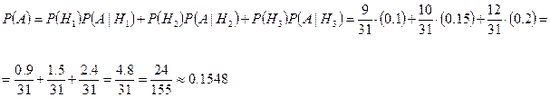 Задание 5. Преподаватель проверяет контрольную по теории вероятностей, которую писали студенты трех групп. В первой группе неудовлетворительно написанные контрольные работы составляют 10%, во второй – 15%, в третьей – 20%. Определить вероятность попадания на проверку неудовлетворительно написанной работы, если всего было сдано 18 работ из первой группы, 20 – из второй и 24 из третьей группы. Решение.
