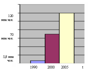 Рис.11. Кількість користувачів Інтернет в Україні. Але з іншого боку в сьгоднішньому становищі України є і позитивні аспекти. Як зазначає член оргкомітету виставки «Інформатика и св’язок-94», президент міжнародного центру информаційнних технологій Писарев Сергеій Евгеньович: „ В той час, коли світова система вступила в епоху формування «інформаційного суспільства», Україна тільки робить перші кроки в цьому напрямі. Не можна сказати, що це погано, навпаки, в України сьогодні дуже виграшна стратегічна позиція, і якщо її реалізувати, то наша держава не тільки має шанс увійти до цивілізованого світу, але і по багатьом аспектам «бути попереду планети всій». Немає необхідності йти довгим шляхом проб і помилок коли є можливість упроваджувати в національному масштабі новітні досягнення світової науки і техніки. Розвинені країни, як правило, такого шансу не мають... В умовах швидкої ситуації, що змінюється, на ринку, що формується, з несталими відносинами ключову роль грає інформованість найширших шарів суспільства. Інститутом проблем реєстрації інформації (ІПРІ) НАН України дуже багато зроблено і робиться для подолання інформаційного вакууму. Програми, що розробляються і ІПРІ, що реалізовуються, направлені на інформатизацію всього суспільства в цілому, на підготовку масового користувача до роботи з інформацією. Реалізований проект телевізійної газети «Все-всім» не має аналогів у всьому світі і унікальний по багатьом параметрам... В найближчому майбутньому ІПРІ стане крупним вузлом глобальної мережі Internet, що дозволить надавати послуги з роботи з банками даних в будь-якій точці земної кулі в режимі «оn-line». На сьогоднішній день існує домовленість з Інститутом наукової інформації США (ISI) про отримання інформації і щотижневе оновлення бази даних Current Соntents no різним розділам і напрямам науки і техніки.... основна увага ми зараз приділяємо підготовці користувачів до рабом з інформацією, привертаючи до цього процесу солідні джерела інформації світового значення. Наприклад, вже встановлені контакти з фірмою «Доу Джонс» світовим лідером в області ділової інформації. Розвиваються відносини і з європейськими організаціями. В рамках тієї, що реалізовується Європейським співтовариством програми інформаційного забезпечення країн СНД, званою ІНТАС, можливо вже цього року українські учені зможуть використовувати обчислювальні потужності найбільших європейських університетів. Ведуться роботи за поданням інформації з ділової мережі БТІ (Німеччина). Пропозицій багато, співпраця із західними партнерами по інформаційному бізнесу справа дуже перспективна, але і проблем в цій справі немало. Найголовніша проблема відсутність надійних і високоякісних каналів зв'язку. Якість ліній на сьогоднішній день украй низька, і це головний стримуючий чинник в розвитку крупних банків даних і могутніх комерційних мереж національного масштабу. Проблемою також є і відсутність високоякісних каналів для прямого виходу в європейські мережі. Наприклад, саме це стримує надання нашим клієнтам послуг німецької мережі Datex-Р і комерційній мережі BTI. З колегами з Німеччини складаються хороші відносини, німці охоче представляють різну інформацію, фахівці ІПРІ проходять навчання в Германії. У такому розвитку подій зацікавлено обидві сторони і це вселяє надію 