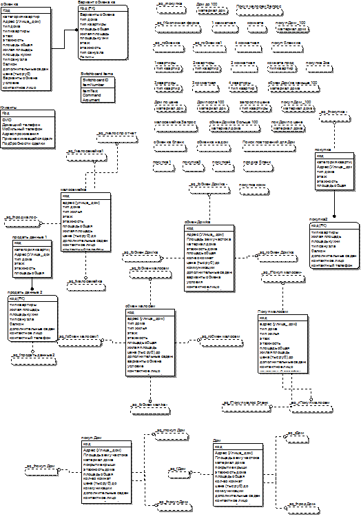 Рисунок 1.3. Информационная модель. 2.1.2 Используемые классификаторы и системы кодированияИсходя из задач поставленных перед нами при разработке данной АС из структуры информации и требований к данной АС применение классификаторов выглядит необоснованным и только перегрузит систему если они будут включены. 2.1.3 Характеристика первичных документов с нормативно-справочной и входной оперативной информацииАвтоматизированная система агентства недвижимости разрабатывается не на пустом месте. В основу методики ее работы положены системы учета уже имеющие многолетний опыт применения, но не оформленные в виде компьютерных программ. Поэтому входными для данными для системы будут являться те же самые данные, которые использовались в неавтоматизированных системах. Каждая из подсистем имеет свой набор входных и выходных данных, причем выходные данные одной подсистемы могут являться входными данными другой подсистемы. Так, например, записи в справочнике клиентов и покупке недвижимости являются входными данными для построения отчета по рынку, являющимся составной частью подсистемы аналитической отчетности. Опишем входные и выходные данные для каждой подсистемы. Для подсистемы ведения справочников входными данными являются соответствующие списки на бумажных носителях. Так, например, для задачи ведения справочника квартир входными данными является список предлагаемых квартир, которыми оперирует компания. Результатом ввода списка квартир в систему будет являться таблица квартир, которая в свою очередь выступает в качестве входных данных при подборе квартир для клиента. Такая же ситуация и со всеми остальными справочниками: обмена, клиентов, домов: все они должны быть предоставлены ответственному за введение информации в базу данных человеку руководством компании на бумажных носителях. Выходными данными являются соответствующие таблицы базы данных. Следует отметить, что таблицы справочников содержат в основном статичную информацию, т.е. не изменяющуюся со временем или изменяющуюся весьма редко. Исключение является справочник клиентов. Хотя новые договора со старыми клиентами заключается весьма не часто, что не требует частого добавления данных в справочник клиентов. Входными данными для заполнения справочника клиентов являются договора с клиентами на бумажных носителях, вводимых риэлтором проводящим сделку. Выходными данными как и в случае других справочников является заполненная таблица клиентов. Для подсистемы составления аналитической отчетности входными данными являются записи в таблицах клиентов и всех таблицах связанных с недвижимостью. Используя массив этих данных, с учетом условий на построение отчетов, наложенных пользователем система строит отчет, которые можно посмотреть на экране монитора или распечатать на принтере. Готовые отчеты и является выходными данными подсистемы аналитической отчетности и всей системы в целом. Сводная таблица справочников показана далее