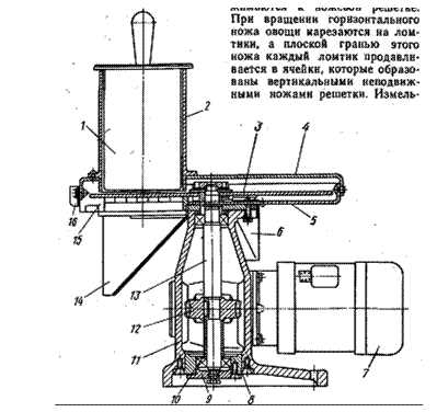 3-нож, 4-крышка, 5-тарелка, 6-лоток для сбора крошек, 7-электродвигатель, 8-крышка корпуса, 9-крышка, 10- втулка, 11- корпус, 12- червячное колесо, 13- вертикальный вал, 14-разгрузочный лоток, 15- ножевая решетка, 16- фиксатор Машина МРОВ-160 предназначена для нарезки вареных овощей, которые используются в основном для приготовления салатов и винигретов. Продукты линейными ножами в трех взаимно перпендикулярных плоскостях (кубиками или кусочками). Машина состоит из привода, корпуса, рабочей камеры, крышки с загрузочным бункером, ножа, ножевых рамок и толкателя. Привод представляет собой электродвигатель с червячным редуктором. Одним концом червяк надет на вал электродвигателя, другим – опирается на запрессованный в корпусе шариковый подшипник. Червячное колесо вращает вертикальный рабочий вал. Последний выходит из корпуса редуктора в рабочую камеру. На выступающий конец рабочего вала насажен прямолинейный нож, закрепленный фасонной гайкой. Нож имеет клиновидную форму с широкой скошенной нижней гранью. Рабочая камера выполнена в виде тарелки с двумя разгрузочными отверстиями. Под отверстием большего размера укреплены две направляющие (для установки сменных ножевых решеток) и разгрузочный лоток. Отверстие меньшего диаметра используется для удаления крошек, образующихся в процессе нарезки продукта. Принцип действия: Вращение от электродвигателя через червячную пару передается прямолинейному ножу. Загруженные в бункер вареные овощи под действием собственной массы и массы толкателя прижимаются к ножевой решетке. При вращении горизонтального ножа овощи нарезаются на ломтики, а плоской гранью этого ножа каждый ломтик продавливается в ячейки, которые образованы вертикальными неподвижными ножами решетки. Измельченный продукт (форма полученных кусочков зависит от формы ячейки ножевой решетки) по наклонной грани лотка поступает в подставленную тару. Задание 5 Что такое процесс измельчения, степень измельчения, классы измельчения? Приведите классификацию измельчительного оборудования. Какую машину (механизм) лучше использовать для механизации технологического процесса? Дать краткое описание исполнительного механизма предлагаемой машины, механизма. Описать устройство рабочих органов. Нарисовать принципиальную схему машины, механизма (получение тонкоизмельченного мясного продукта)