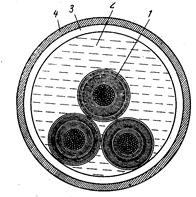 Рис.2. Маслонаполненный кабель высокого давления в стальном трубопроводе. 1-одножильный кабель 2-масло 3-стальной трубопровод 4-антикоррозионный покров В маслонаполненных кабелях отечественного производства масло, пропитывающее изоляцию жил кабеля, находится под избыточным давлением (0,3—1,6МПа). Применение кабелей высокого давления наиболее целесообразно при напряжении 220—500 кВ на прямых трассах. |
