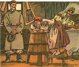А. Базилевич. Ілюстрація до повісті І. Нечуя'Левицького «Кайдашева сім’я» і лицемірство Кайдашихи виявляються саме в стосунках із невістками. Яскравим засобом, що характеризує Марусю, є її мова. Спочатку в її звертаннях до Мотрі багато меду: «моє золото», «серце», «дитя моє», — а згодом: « — Дай сюди мотовило! Це не твоє, а моє. Принеси од свого батька та й мотай на йому, про мене, свої жили, — крикнула Кайдашиха й ухопила рукою мотовило… — Дай сюди, бо як пхну, то й ноги заде реш! — кричала Кайдашиха й сіпала до себе мотовило… — Це не Мотря, а бендерська чума… — Твої діти такі зміюки, як i ти… Напло дила вовченят, то не пускай до моєї дiжi…» Не поступається в лихослів’ї Кайдашисі й «бриклива» Мотря, з її уст лунають репліки на зразок: « — Не беріть од баби гостинця, бо вона злодійка! (про Кайдашиху, звертаю' чись до дітей). — У мене свекруха люта змія: ходить по хаті, полум’ям на мене дише, а з но са горить дим кужелем. На словах, як на цимбалах грає, а де ступить, то під нею лід мерзне; а як гляне, то од її очей молоко кисне». Якщо характери старих Кайдашів статичні, бо сформовані (уже представля' ють ціле покоління українського селянства), то в молодшого покоління вони тільки формуються.