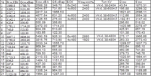 где tgjб -базовый коэффициент реактивной мощности принимаемый для сетей 6-10 кВ присоединенных к шинам подстанций с высшим напряжения 110 кВ, tgjб= =0,5; k-коэффициент учитывающий отличие стоимости электроэнергии в различных энергосистемах, для Омской энергосистемы: к = 0,8; dм -это отношение потребления активной мощности потребителем в квартале max нагрузок энергосистемы к потреблению в квартале max нагрузок потребителя, для Омской энергосистемы: dм = 0,7; Qэкон. = Рр · tgfэ = 42404 ·0,625=26593,368 кВар, Мощность компенсирующих устройств, которые необходимо установить на предприятии, рассчитываем по выражению: