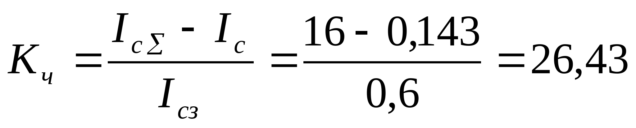 Расчет токов короткого замыкания в точке К1: Базисную мощность принимаем Sб = Sс =1000 МВ А. х*с - сопротивление системы, равно 0,42 о.е. Для точки К1 базисное напряжение Uб = 115 кВ. Базисный ток определяем по формуле: Расчетное индуктивное сопротивление системы: Расчет токов короткого замыкания по расчетным кривым Реактивное сопротивление воздушной линии: где х0 – удельное сопротивление 1 км линии, х0 = 0,444 Ом/км для воздушной линии сечением АС-70; l - длина линии 14 км, Активное сопротивление воздушной линии: где r0 – активное сопротивление 1 км линии: где S – сечение провода 70 мм2. Результирующее сопротивление до точки К1. Значение периодической составляющей тока короткого замыкания где kt – кратность тока к.з., определяемая по расчетным кривым /10 / для момента времени t = 0 kt = 1,12 при t = Начальное значение периодической слагающей тока короткого замыкания Действующее значение установившегося тока короткого замыкания: Ударный ток к.з. в точке К1: iуд = kуд где kуд – ударный коэффициент kуд= 1,8 Наибольшее действующее значение полного тока к.з. Мощность короткого замыкания в точке К1 Расчет токов короткого замыкания в точке К2: Для точки К2 базисное напряжение Uб = 10,5 кВ. Базисный ток Сопротивление трансформаторов где UК– напряжение короткого замыкания трансформатора; Sном т – номинальная мощность трансформатора. Результирующее сопротивление до точки К2 Ударный ток к.з. в точке К2 iуд =1,7 где значение ударного коэффициента kуд= 1,7 . Наибольшее действующее значение полного тока к.з. Мощность короткого замыкания в точке К2: Расчет токов короткого замыкания в точке К3: Активное сопротивление кабельной линии где r0 - сопротивление 1 км линии определяется по таблице П.2 /17/ r0 = 0,167 Ом/км; l - длина кабельной линии 465 м; Индуктивное сопротивление кабельной линии где х0 - сопротивление 1 км линии, х0 = 0,077 Ом/км см. таблицу П.1 /17/. Результирующее сопротивление до точки К3: Ток короткого замыкания в точке К3: Ударный ток к.з. определяется по формуле: iуд = kуд где kуд – ударный коэффициент kуд= 1,72 определяем по рисунку 5-10 /10/ в зависимости от отношения x / r = 12,6 / 1,17 = 10,77. iуд =1,72 Наибольшее действующее значение полного тока к.з.: Мощность короткого замыкания в точке К3: Расчет токов короткого замыкания в точке К4: Активное сопротивление кабельной линии где r0 - сопротивление 1 км линии определяется по таблице П.2 /17/ r0 = 0,443 Ом/км; l - длина кабельной линии 125 м; Индуктивное сопротивление кабельной линии где х0 - сопротивление 1 км линии, х0 = 0,086 Ом/км см. таблицу П.1 /17/ Результирующее сопротивление до точки К4: Ток короткого замыкания: Ударный ток к.з. в точке К4 iуд =1,47 где kуд= 1,47 определяем по рисунку 5-10 / / по отношению x / r = 25,64 / 5,55 = 4,6. Наибольшее действующее значение полного тока к.з. Мощность короткого замыкания в точке К4: Расчет токов короткого замыкания в точке К5: Активное сопротивление кабельной линии где r0 - сопротивление 1 км линии определяется по таблице П.2 /17/ r0 = 0,443 Ом/км; l - длина кабельной линии 430 м; Индуктивное сопротивление кабельной линии где х0 - сопротивление 1 км линии, х0 = 0,086 Ом/км см. таблицу П.1 /17/ Результирующее сопротивление до точки К5: Ток короткого замыкания: Ударный ток к.з. в точке К5 iуд =1,47 где kуд= 1,47 определяем по рисунку 5-10 / / по отношению x / r = 25,64 / 5,55 = 4,6. Наибольшее действующее значение полного тока к.з. Мощность короткого замыкания в точке К4: Результаты расчета приведены в таблице 10.1. Табли