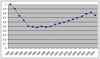 Динамика реальной начисленной заработной платы в России в 1991—2008 годах, в % к уровню 1991 года. · По мнению академика РАН А. Д. Некипелова, реформы 1990-х годов (в частности, максимальная либерализация экономической деятельности, произвольное распределение госсобственности, финансовая стабилизация за счёт жёсткого ограничения совокупного спроса) привели к созданию убогой квазирыночной системы, особенностями которой были «беспрецедентная натурализация хозяйственной деятельности, устойчивое значительное превышение процентной ставкой уровня отдачи капитала в реальном секторе и неизбежная в этих условиях ориентация всей экономики на финансово-торговые спекуляции и растаскивание ранее созданного богатства, хронический фискальный кризис, вызванный возникновением „дурной последовательности“: „дефицит бюджета — сокращение государственных расходов — спад производства и разрастание неплатежей — сокращение налоговых поступлений — дефицит бюджета“». · Под влиянием гиперинфляции произошла глубокая деформация всех стоимостных пропорций и соотношения цен на продукцию отдельных отраслей, изменившая стоимостные основания финансовой, бюджетной и кредитно-денежной системы. Индекс потребительских цен с 1992 г. по 1995 г. увеличился в 1187 раз, а номинальная зарплата — в 616 раз. Тарифы на грузовые перевозки увеличились за те годы в 9,3 тыс. раз, а индекс цен реализации продукции сельского хозяйства производителями продукции повысился всего в 780 раз, в 4,5 раз меньше, чем в промышленности. Неравновесие доходов и расходов достигло за годы преобразований такого уровня, что механизм неплатежей перестал справляться с его сбалансированием. · Заметное обеднение едва ли не большинства населения России в начале 90-х годов: жизненный уровень основной массы населения снизился по многим характеристикам в 1,5-2 раза — до показателей 60-70-х годов. · Структура промышленного производства за годы преобразований также изменилась. Произошло снижение наукоемких производств, техническая деградация экономики, свертывание современных технологий. Падение производства в России по своим масштабам и длительности значительно превысило все известные в истории кризисы мирного времени. В машиностроении, промышленном строительстве, легкой, пищевой промышленности и во многих других важнейших отраслях производство сократилось в 4—5 раз, расходы на научные исследования и конструкторские разработки — в 10 раз, а по отдельным направлениям — в 15—20 раз. Главным источником экспортных доходов являлись сырьевые ресурсы. Удельный вес сферы услуг вырос, однако доля личных услуг сократилась, а доля услуг сферы обращения увеличилась. Экспорт сырья позволял финансировать первоочередные бюджетные нужды, но внешнеэкономические связи выступали скорее как текущий конъюнктурный стабилизатор экономики, а не механизм повышения конкурентоспособности. Иностранные кредиты, полученные Россией на преобразования и стабилизацию экономики являлись важным средством сбалансированности бюджета. За 15 лет, прошедших с начала рыночных реформ в России, один из наиболее существенных спадов по сравнению с другими отраслями промышленности испытало судостроение. · При переходе к рыночной экономике появился рынок труда, увеличилась безработица. По методологии Международной организаци