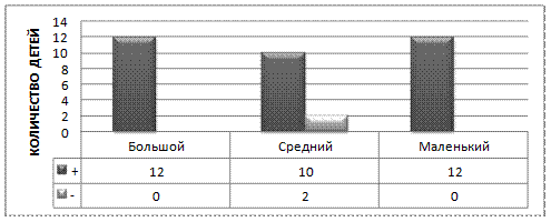 С вышеуказанными детьми систематически и целенаправленно был проведен педагогический эксперимент. Цель : Повышение уровня восприятия детьми сенсорных эталонов величины, цвета, формы. Время проведения: 20.09.10-20.10.10 г. Метод: Педагогический эксперимент, наблюдение за практической деятельностью младших дошкольников. Приемы : Сенсорное обследование с одновременным наглядным объяснением. Оборудование : Система дидактических игр на воспитание восприятия детьми цвета, формы, величины. Система дидактических игр на воспитание восприятия цвета: 1. Спрячь мышку. Дидактическая задача: закрепить у младших дошкольников представления о 4 цветах (красный, синий, желтый, зеленый). 2. Подбери по цвету. Дидактическая задача: закрепить у младших дошкольников представления о 4 основных цветах (красный, синий, желтый, зеленый), научить классифицировать предметы по форме. 3. У кого какое платье. Дидактическая задача: закрепить умение детей выбирать по слову, обозначающему цвет, различать основные 4 цвета. (Приложение 1.) Система дидактических игр на воспитание восприятия формы: 1. Подбери фигуру. Дидактическая задача: Закрепить представления детей о геометрических фигурах, упражнять в их названии. Закреплять навык обследования геометрических форм приемом обследования и накладывания. 2. Кому какая форма. Дидактическая задача: закрепить навыки детей при группировке геометрических фигур (кругов, овалов). 3.Геометрическое лото. Дидактическая задача: закрепить умение детей сравнивать форму изображаемого предмета по образцу (геометрическая фигура) (Приложение 2.) Система дидактических игр на воспитание восприятия величины: 1. Башня. Дидактическая задача: закрепить представление об относительности величины предмета, дать представление об отношениях по величине между плоскими и объемными предметами. 2. Что там? Дидактическая задача: закрепить умения детей устанавливать отношение 3 предметов по величине при составлении матрешки. 3. Сбор фруктов. Дидактическая задача: развить глазомер при выборе по образцу предметов определенной величины. (Приложение 3.) Комплексная дидактическая игра 4. Комплексная игра. Лото «Цвет и форма». 5. Дидактическая задача: закрепить представления детей о 5 геометрических фигурах (круг, овал, квадрат, прямоугольник, треугольник) и 4 основных цветов (красный, синий, желтый, зеленый), научить ориентироваться на 2 признака одновременно (цвет и форма), отвлекаясь от величины. (Приложение 4.) 2.3. Контрольный эксперимент После проведения системы дидактических игр был проведён контрольный эксперимент. Выявлялось восприятие цвета, величины, формы младших дошкольников обоих подгрупп: участвующих в эксперименте и не прошедших обучение посредством дидактических игр. Цель: Выявить закрепление знаний младших дошкольников 2007 года участвующих в эксперименте. Сравнить полученные данные с умениями и знаниями младших дошкольников первой подгруппы, не участвующих в эксперименте. Время проведения: 20.10.10- 20.11.10 Методы: Педагогический эксперимент, показ практических действий. Приемы: Сенсорное обследование с наглядным объяснением. Оборудование: Набор геометрических плоскостных фигур (круг, овал, треугольник, прямоугольник, квадрат) 4 основных цвета (красный, синий, зеленый, желтый) 3 разных величин (большой, средний, маленький). Диагностика № 4 Величина