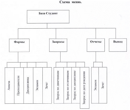 В этом меню 3 уровня. Задание 1. 1. Создать меню 1-го уровня: закройте все таблицы, формы, отчеты, запросы; выберете пункт меню «Сервис - Служебные программы - Диспетчер кнопочных форм », в ответ на вопрос « Создать кнопочную форму?» нажать кнопку Да. Перед Вами окно Диспетчера кнопочных форм; нажать кнопку «Изменить »; ввести название кнопочной формы «Студенты МичГАУ »; нажать кнопку «Закрыть» ; нажать кнопку «Создать»; в окне «Создание » ввести текст «Формы », ОК . нажать кнопку «Создать »; в окне « Создание » ввести текст «Запросы », ОК . нажать кнопку «Создать »; аналогично создать следующие страницы кнопочной формы: «Отчеты », «Выход ». 2. Создать меню 2-го уровня Теперь последовательно будем раскрывать каждый пункт меню 1-го уровня (для наглядности можно ориентироваться на схему меню). ♦ Отметить курсором главную кнопочную форму «Студент » и нажать кнопку «Изменить». ♦ Создать элемент кнопочной формы. ♦ Текст «Формы ». ♦ Команда «Перейти к кнопочной форме ». ♦ Кнопочная форма - выбрать из списка «Формы », ОК . ♦ Создать элемент кнопочной формы. ♦ Текст «Запросы ». ♦ Команда «Перейти к кнопочной форме ». ♦ Кнопочная форма - выбрать из списка «Запросы », ОК . ♦ Создать элемент кнопочной формы. ♦ Текст «Отчеты ». ♦ Команда «Перейти к кнопочной форме ». ♦ Кнопочная форма - выбрать из списка «Отчеты », ОК. ♦ Создать элемент кнопочной формы . ♦ Текст «Выход ». ♦ Команда «Выйти из приложения ». ♦ Кнопочная форма - выбрать из списка «Выход », ОК . Закрыть окно «Изменение страницы кнопочной формы», Вы вернулись в окно «Диспетчер кнопочных форм » 3. Создать меню 3-го уровня: Установить курсор на страницу «Формы » и нажать кнопку изменить . Вы находитесь в окне «Изменение страницы кнопочной формы »: ♦ Создать элемент кнопочной формы. ♦ Текст «Анкета ». ♦ Команда «Открыть форму для изменения » ♦ Кнопочная форма - выбрать из списка «Анкета », ОК . ♦ Создать элемент кнопочной формы. ♦ Текст «Преподаватели ». ♦ Команда «Открыть форму для изменения ». ♦ Кнопочная форма - выбрать из списка «Преподаватели » ОК . ♦ Создать элемент кнопочной формы . ♦ Текст «Дисциплины ». ♦ Команда «Открыть форму для изменения ». ♦ Кнопочная форма - выбрать из списка «Дисциплины », ОК . ♦ Создать элемент кнопочной формы. ♦ Текст «Группы ». ♦ Команда «Открыть форму для изменения ». ♦ Кнопочная форма - выбрать из списка «Группы », ОК . Вы создали меню для ввода и корректировки информации в базу данных, теперь создадим меню для вызова запросов. Задание 2. Создать меню 3-го уровня для вызова запросов. Закрыть окно «Изменение страницы кнопочной формы », если Вы в нем находитесь. Вы опять в Диспетчере кнопочных форм. Установить курсор на страницу «Запросы » и нажать кнопку изменить . Вы находитесь в окне «Изменение страниц кнопочной формы »: ♦ Создать элемент кнопочной формы. ♦ Текст «Запрос по двоечникам ». ♦ Команда «Открыть форму для изменения ». ♦ Кнопочная форма - выбрать из списка «Запрос по двоечникам», ОК . Аналогично создать элементы кнопочной формы для других запросов. Задание 3. Создать меню 3-го уровня для просмотра отчетов, выполнив действия аналогичные действиям при создании меню для форм и запросов.