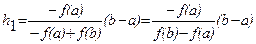Далее этот прием применяем к одному из отрезков [a, x1 ] или [x1 , b], на концах которого функция f(x) имеет противоположные знаки. Аналогично находим второе приближение x2 и т.д. Геометрически этот способ эквивалентен замене кривой y = f(x) хордой, проходящей через точки А[a, f(a)] и B[b, f(b)].