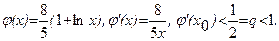 Следствие 1. Если требуется найти корень с точностью ε, то кончаем итерационный процесс тогда, когда Следствие 2. Так как Теорема 2. Если Привести уравнение f(x)=0 к виду x=φ(x) таким образом, чтобы получить сходящийся итерационный процесс, можно различными способами. Рассмотрим два из них: 1) уравнение f(x)=0 равносильно при λ≠0 уравнению λf(x)=0 и уравнению x= λf(x)+x. Обозначим λf(x)+x через φ(x), получим x= φ(x). Параметр λ подберем так, чтобы функция φ'(x)= λf'(x)+1 на [a, b] была по модулю меньше единицы. 2) если Пример. Методом итерации найти корень уравнения 5x-8lnx=8 с точностью 0,01. Решение. Запишем уравнение в виде