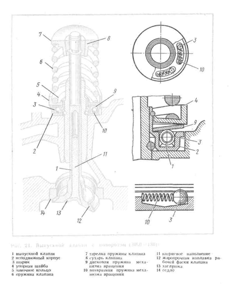 Распределительные механизмы выполняются двух разновидностей, определяемых расположением клапанов: механизм с нижними (боковыми) и механизм с верхними (подвесными) клапанами; нижние клапаны располагаются в блоке цилиндров, а верхние — в головке цилиндров. Современные двигатели имеют верхние клапаны. Верхнее расположение клапанов показано на примере устройства распределительного механизма двигателя ГАЗ-53 (рис. 20). Распределительный вал через кулачок и толкатель /действует не непосредственно на клапан, а через систему, состоящую из штанги 2, регулировочного винта 7 с гайкой 6, коромысла 5 с осью 8. Эти детали своей массой увеличивают силы инерции частей, движущихся возвратно-поступательно, поэтому ставят усиленные клапанные пружины 12. Клапан 3 движется в направляющей 4; при уходе кулачка из-под толкателя пружина прижимает клапан к его седлу и возвращает все детали в исходное положение. Иногда внутри первой ставят вторую пружину (двигатели ЯМЗ-236, ЯМЗ-238), которая кроме усиления узла, исключает опускание клапана в цилиндр при поломке одной из них; вторая пружина, кроме того, позволяет сократить общую высоту клапанной группы. Коромысла устанавливаются на пустотелой оси в подшипниках, я ось находится в кронштейнах, крепящихся к головке блока цилиндров. Плечо, находящееся под действием штанги, выполняется короче другого плеча, действующего на клапан. Неравенство длины плеч коромысла позволяет сократить перемещения и ускорения толкателя при необходимых перемещениях клапана. .Вместе с тем при более длинном плече точка касания клапана с рычагом движется по дуге большего радиуса и меньше отклоняется от осевой линии клапана, что сокращает поперечные проскальзывания этой точки по торцу стержня клапана и противодействует перекосу клапана. При верхнем расположении клапанов удается получить камеру сгорания близкой к полусферической, а также несколько улучшить наполнение цилиндров из-за более плавных форм каналов для прохождения смеси. Количество кулачков распределительного вала соответствует числу клапанов, а расположение их на валу определяется условием чередования вспышек в соответствии с формой коленчатого вала, числом цилиндров и принятым порядком работы двигателя. Форма, количество и расположение кулачков должны обеспечивать своевременное и достаточно полное открытие клапанов. Из работы четырехтактного двигателя ясно, что на цикл, занимающий два оборота коленчатого вала, приходится одно открытие каждого клапана, т. е. двум оборотам коленчатого вала должен соответствовать один оборот кулачка (распределительного вала). Поэтому передаточное число привода от коленчатого вала к распределительному должно быть равно двум (число зубьев шестерен коленчатого вала делается в два раза меньше числа зубьев шестерни распределительноговала). Клапанная группа Форма впускных и выпускных клапанов чаще всего одинакова; клапан состоит из плоской головки и стержня. Плавный переход от головки к стержню повышает отвод тепла от головки, делает его более прочным и улучшает обтекание головки клапана газами. На конце стержня клапана имеется выточка для крепления опорной тарелки со втулкой 10 (см. рис. 20), -закрепляемыми разрезными коническими сухариками 9; эти детали удерживают пружину 12. Наклонное расположение клапана относительно оси ци