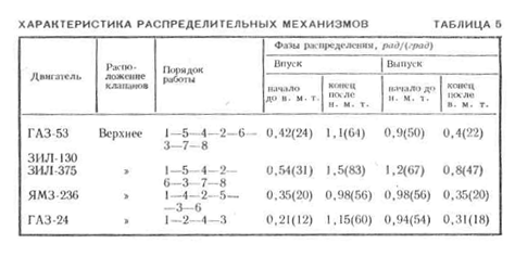 Распределительные валы изготовляют штамповкой из стали или отливкой их из специального чугуна, кулачки и опорные шейки подвергают закалке. Привод к распределительному валу осуществляется обычно двумя (парой) шестернями. Для уменьшения шума их выполняют с косыми зубьями, а большая из них (шестерня распределительного вала) изготовляется из текстолита (двигатель ГАЗ-53) или чугуна (двигатель ЗИЛ-130). Шестерня коленчатого вала обычно стальная. Шестерни привода распределительного механизма имеют торцовые метки для правильной установки их в соответствии с моментами открытия клапанов. Привод к распределительному валу чаще всего расположен в передней части двигателя и закрыт крышкой. В рядных двигателях распределительный вал расположен с одной стороны двигателя, а в V-образных — размещается между рядами цилиндров. При рассмотрении работы двигателя было установлено, что теоретическое протекание отдельных тактов в полном соответствии с каждым полуоборотом коленчатого вала не обеспечивает хорошего тепло-использования топлива. Для лучшего наполнения цилиндра свежей смесью и лучшей очистки цилиндра от отработавших газов фазы распределения (моменты) начала и конца каждого процесса несколько сдвигаются против теоретических, соответствующих мертвым точкам. Процессы становятся более продолжительными, в них используется инерция смеси и газов. Впускной клапан открывают с опережением (до в. м. т.), чтобы использовать инерцию выходящих отработавших газов для подсасывания свежей смеси. Для лучшего наполнения цилиндра используются разрежение над поршнем в начале выхода его из нижней мертвой точки и инерция свежей рабочей смеси, входящей в цилиндр с большой скоростью, в результате закрытие впускного клапана происходит с некоторым запаздыванием. Эффективность выталкивания отработавших газов из цилиндра зависит от момента начала этого процесса: захватывая конец расширения, можно за счет части рабочего хода, потеряв некоторую долю работы расширения, улучшить процесс выпуска (он происходит в этом случае с опережением). Используя давление и инерцию отработавших газов, целесообразно для лучшего очищения цилиндра закрывать выпускной клапан не в верхней мертвой точке, а несколько позже. Моменты начала и конца впуска и выпуска зависят от быстроходности (числа оборотов в минуту) двигателя; с увеличением ее фазы расширяются.