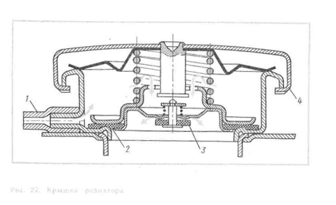 Водяные рубашки цилиндров являются составной частью блока цилиндров и головки. Важное значение для охлаждения цилиндров имеют размеры рубашек с водой, окружающих цилиндры. Эти рубашки заканчиваются за нижним положением поршневых колец или размещаются по всей длине цилиндра. Длинные рубашки способствуют отводу тепла и снижению температуры масла в системе смазки. Между стенками соседних цилиндров оставляются свободные проходы для охлаждающей воды, что улучшает отвод тепла из мест его наибольшей концентрации (между близко располагающимися горячими стенками цилиндров) и устраняет возможность неравномерной деформации цилиндров от нагрева их в поперечном сечении. Достижению этой цели способствует также расположение боковых клапанов с небольшим наклоном, поэтому пространство между стенками газопроводных каналов и цилиндров несколько увеличивается. Общее устройство радиатора показано на рис. 2б,а. Его главная часть — охлаждающая сердцевина 5 — вверху связана с верхним бачком 2, а внизу — с нижним 7; каждый бачок имеет по патрубку 9 и 8; из верхнего бачка выводится трубка 4 для отвода пара при закипании воды. Закрывается радиатор крышкой .
