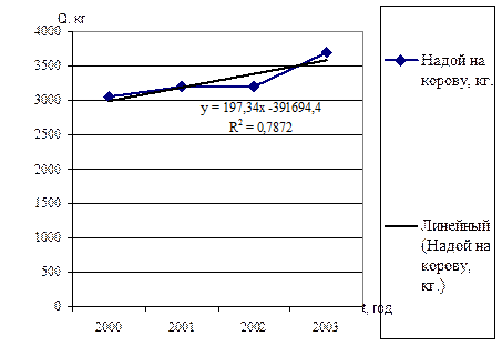 Рис. 3. Изменения надоев молока на корову по годам В результате анализа показателей 2000 – 2003 гг., построения графиков зависимостей уровней ряда от времени была выявлена устойчивая тенденция роста. На рис. 1 - 3 данная тенденция показана в виде линейного тренда. Линейный тренд представлен наиболее простой линейной функцией Устойчивость временных значений тренда подтверждается значениями t – статистика, которые рассчитываются как отношение коэффициентов регрессии к их средним квадратическим отклонениям (табл.15). 3.1.2 Материально-денежные затраты на производство продукции животноводстваРазрабатываемая модель оптимальной структуры производства животноводческой продукции, ориентирована на получение максимальной прибыли, поэтому немаловажное значение при ее построении играют общие затраты денежно-материальных средств на получение молока и мяса крупнорогатого скота. В табл. 12 рассмотрим общие статьи затрат. Проанализируем динамику затрат на производство молока в табл. 12. Таблица 12 Затраты на производство молока, тыс.р.