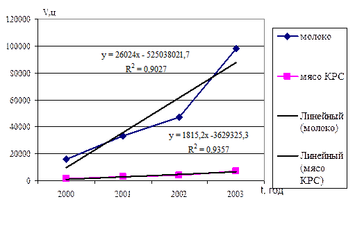 Изменение реализованного количества молока и мяса КРС по годам представлено на рис. 6.