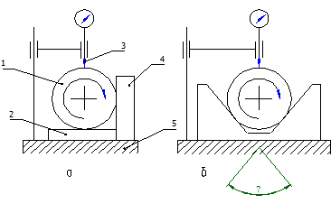 Дух контактный способ позволяет выявить овальность и огранку с четным числом граней. При измерении по этому способу отклонение от круглости будет равно половине разности между наибольшим и наименьшим диаметрами поперечного сечения, которые определяют при поворачивании детали 1 между измерительной головкой 3 и узкой опорой 2, установленной на поверочной плите 5 (рисунок а). для удобства рекомендуется пользоваться боковым упором 4.