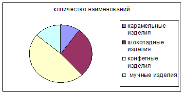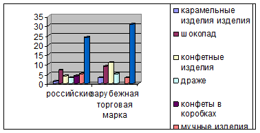 Органолептическую оценку качества печенья начинают с внешнего оформления, маркировки и выявления отклонений в массе. Путем осмотра пачки печенья устанавливают: четкость печати, рисунка и надписей, яркость этикетки. Внешне изделие должно быть привлекательным и оформлено со вкусом. Также обращают внимание на наличие (или отсутствие) на упаковочном материале загрязнений, пятен жира, разрывов. Состояние упаковки (завертки) печенья проверяют на плотность завертки, учитывая перекос этикетки. По дате выпуска печенья проверяют соблюдение гарантийного срока хранения. Представленный ассортимент остановочного павильона изобразим графически: .. Таким образом, из диаграммы видно, что большую часть ассортимента кондитерских изделий представляют конфетные изделия. Проведем анализ данного ассортимента по производителям. В основном ассортимент торгового павильона представлен российскими производителями, но имеется такая особенность, что основная масса кондитерских изделий имеет торговую марку иностранного производителя, но производится на российских предприятиях. Это относится к таким маркам как Марс, Сникерс, Баунти, Пикник, Милки Уэй, Несквик и другие. Всего имеется 55 наименований кондитерских изделий из них 24 ассортиментных единиц представлены только российскими производителями, остальные – имеют торговую марку иностранного производителя. Изобразим на рисунке: