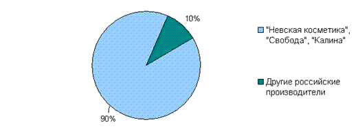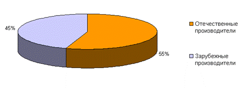 Рисунок 1. Совокупная доля ОАО «Невская косметика», ОАО «КО «Свобода» и ОАО «Концерн «Калина» в объеме производства зубной пасты в России, % в натуральном выражении. Преимущественная доля зубной пасты, представленной на российском рынке, производится отечественными производителями – доля российских производителей на рынке составляет около 55% в натуральном выражении по отношению к 45%, остающимся за зарубежными производителями (Рисунок 2). Примечательно, что на долю мировых лидеров в производстве зубной пасты (Colgate-Palmolive, Procter&Gamble, GlaxoSmithKline) приходится 18% российского рынка в натуральном выражении. На экспорт поступает порядка 15-20% российской зубной пасты, среди основных стран-импортеров отечественной продукции страны Украина, Казахстан, страны Прибалтики.